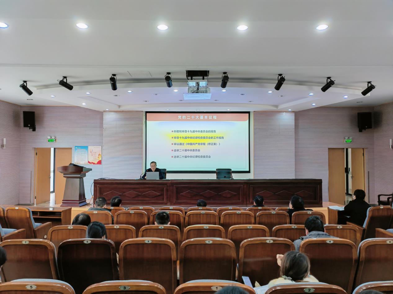 胡朋林以“自信自强团结奋斗,以中国式现代化全面推进中华民族伟大复兴”为题,从党的二十大主题,主要成果,过去5年的工作和新时代10年的伟大变革,马克思主义中国化时代化,中国式现代化,全面建设社会主义现代化国家的目标任务,坚持党的全面领导和全面从严治党,应对风险挑战,教育、科技、人才工作的战略部署等方面,对党的二十大提出的新思想新论断、作出的新部署新要求,作了全面宣讲和深入阐释。