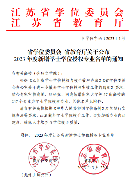 近日,江苏省学位委员会和江苏省教育厅下发《关于公布2023 年度新增学士学位授权专业名单的通知》(苏学位字函〔2023〕1号),365bet官网娱_bt365体育在线_365bet投注官网新增的能源化学、应用统计学、光电信息科学与工程、智能装备与系统、数据科学与大数据技术5个专业获批为学士学位授权专业。
