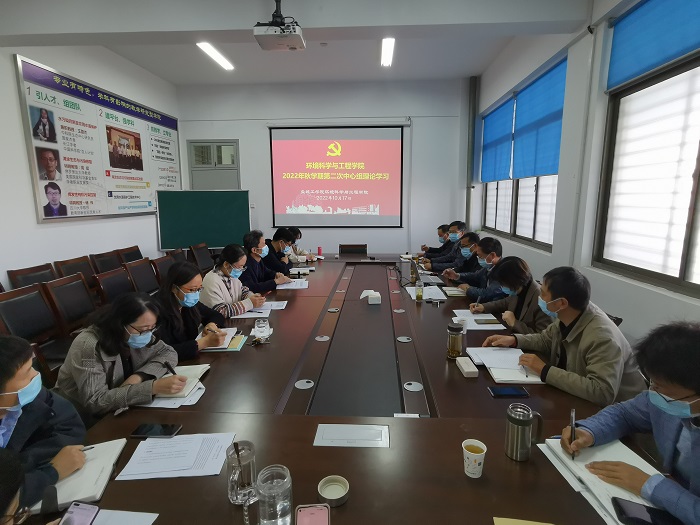 10月17日上午,环境学院党总支理论学习中心组在会议室开展集中学习研讨,会议由学院党总支书记陈阳主持,校党委第三巡学旁听组组长田为龙、成员束安娣到会指导,学院党总支理论中心组成员参加。