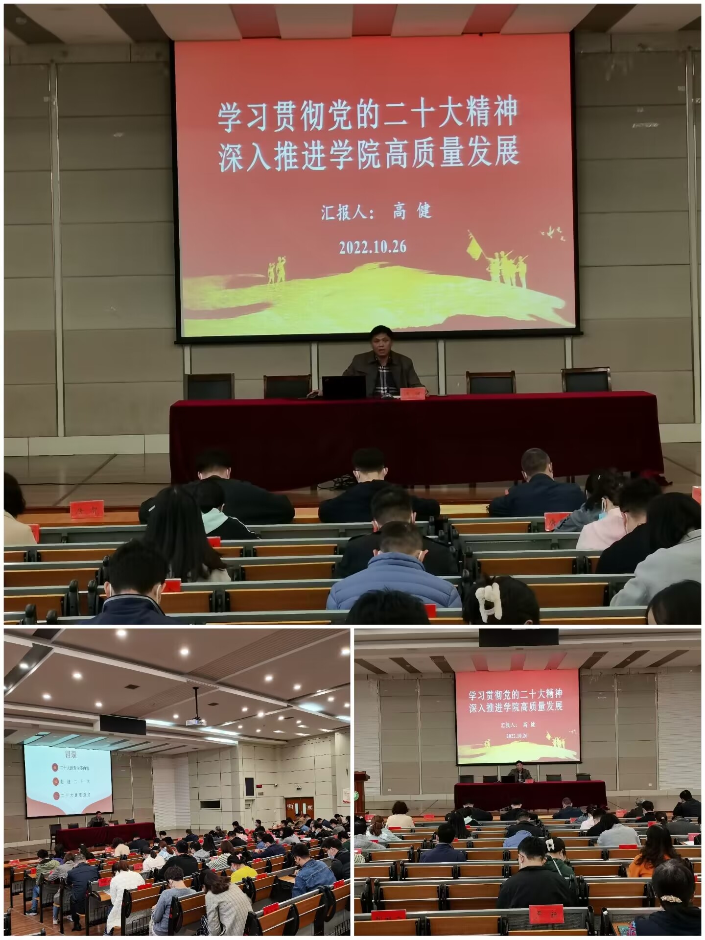 高健从学习党的二十大报告主要内容、三十个关键词带你走进二十大以及学习贯彻党的二十大精神具有哪些重要意义等方面进行分析,他强调,党的二十大是我们党进入全面建设社会主义现代化国家、向第二个百年奋斗目标进军新征程的重要时刻召开的一次十分重要的代表大会,是党和国家政治生活中的一件大事。他指出,要将习近平新时代中国特色社会主义思想融入到为党育人、为国育才的使命任务中去。作为高校教师,一定要不忘初心、牢记使命,培育德智体美劳全面发展的人才。他表示,要牢记“空谈误国,实干兴邦”的思想,学院全体教职工要为全面建成社会主义现代化强国,实现中华民族伟大复兴的中国梦贡献力量。他还强调,要进一步增强使命自觉,真正做到三个务必:务必不忘初心、牢记使命;务必谦虚谨慎、艰苦奋斗;务必敢于斗争、善于斗争。