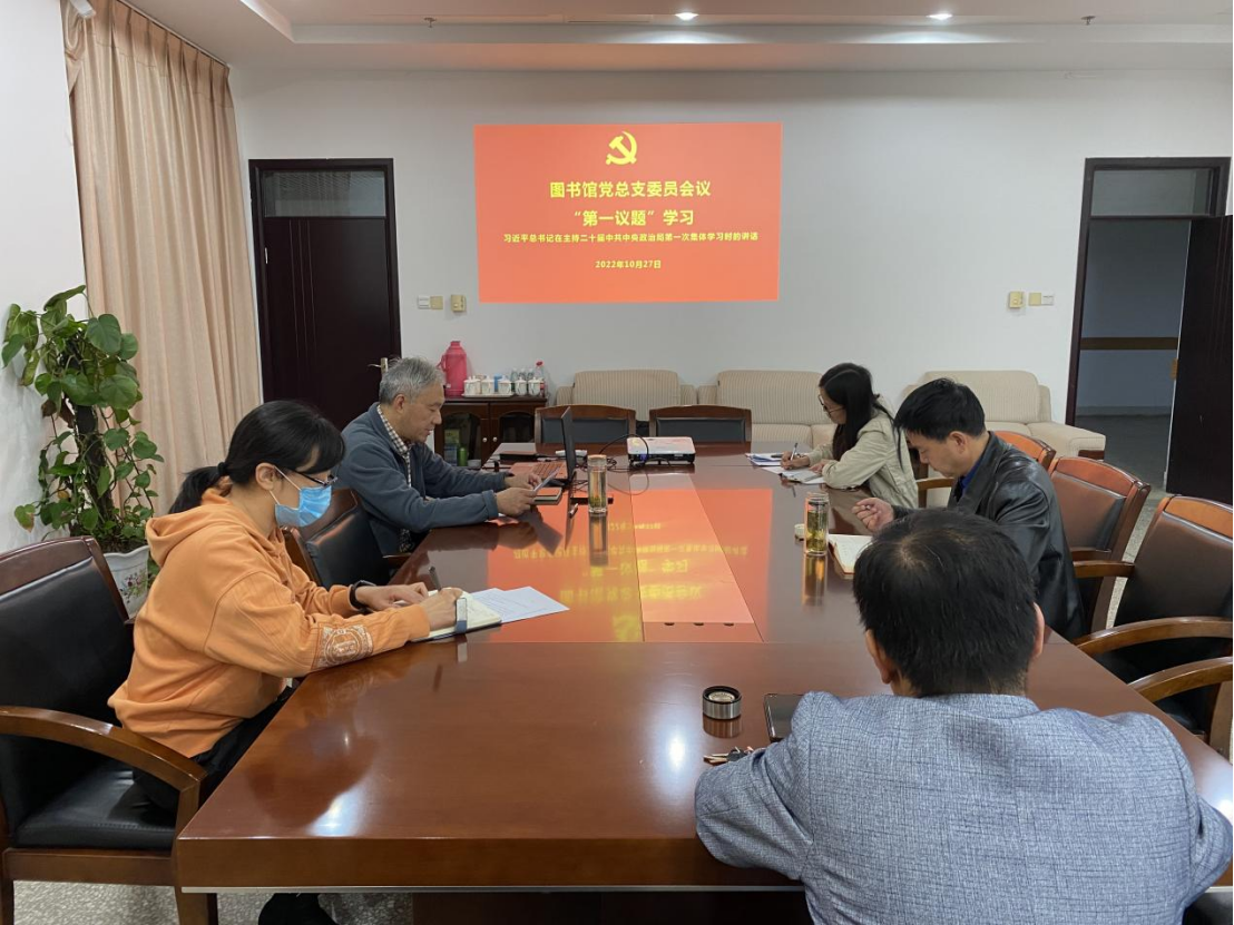 10月27日下午,图书馆党总支以“第一议题”形式学习习近平总书记在主持二十届中共中央政治局第一次集体学习时的讲话精神。馆党总支书记花爱军主持会议,党总支全体委员参加。